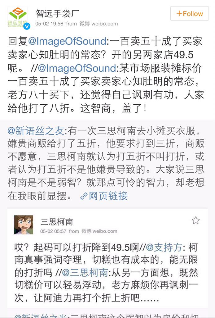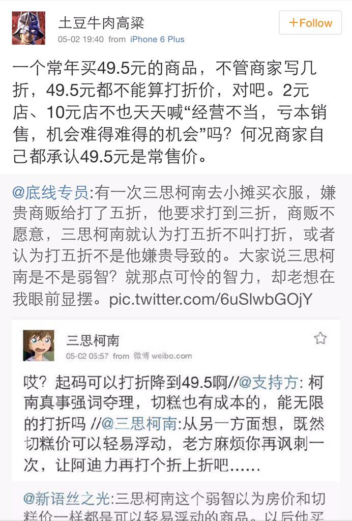 方舟子 @fangshimin · May 2有一次三思柯南去小摊买衣服,嫌贵商贩给打了五折,他要求打到三折,商贩不愿意,三思柯南就认为打五折不叫打折,或者认为打五折不是他嫌贵导致的。大家说三思柯南是不是弱智?就那点可怜的智力,却老想在我眼前显摆。 https://pbs.twimg.com/media/CEDAuCvUkAAJS55.jpg:large