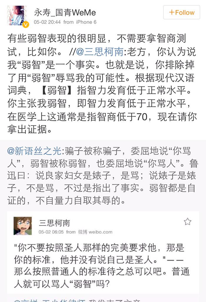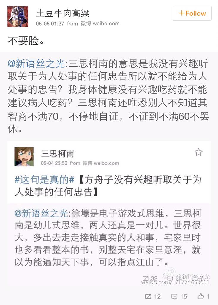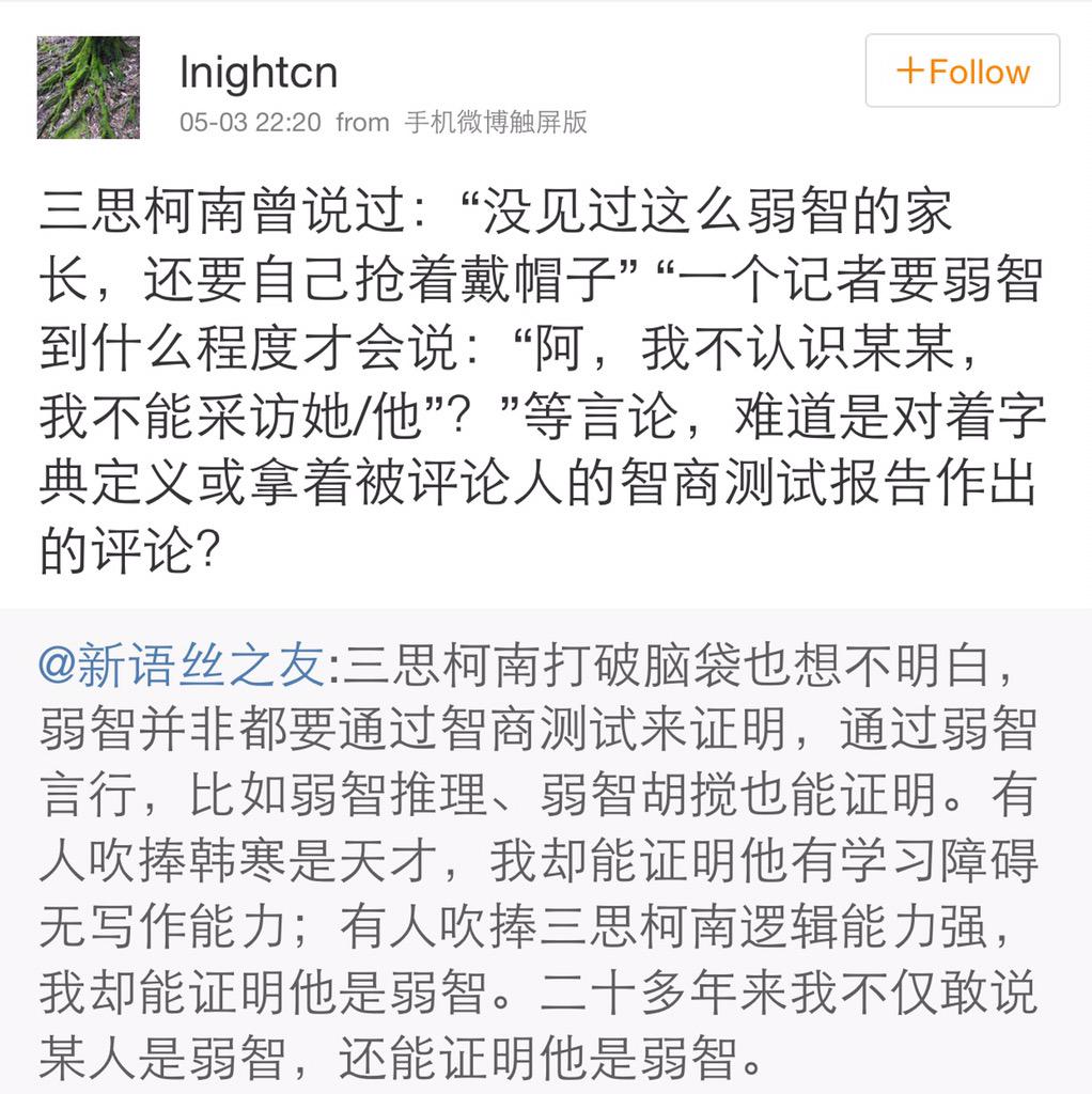 方舟子 @fangshimin · May 2三思柯南这种人如果到美国工作、生活,肯定会经常被人说是个idiot,然后他就会翻出词典上关于idiot的定义,满世界追着要人证明他真的是idiot……