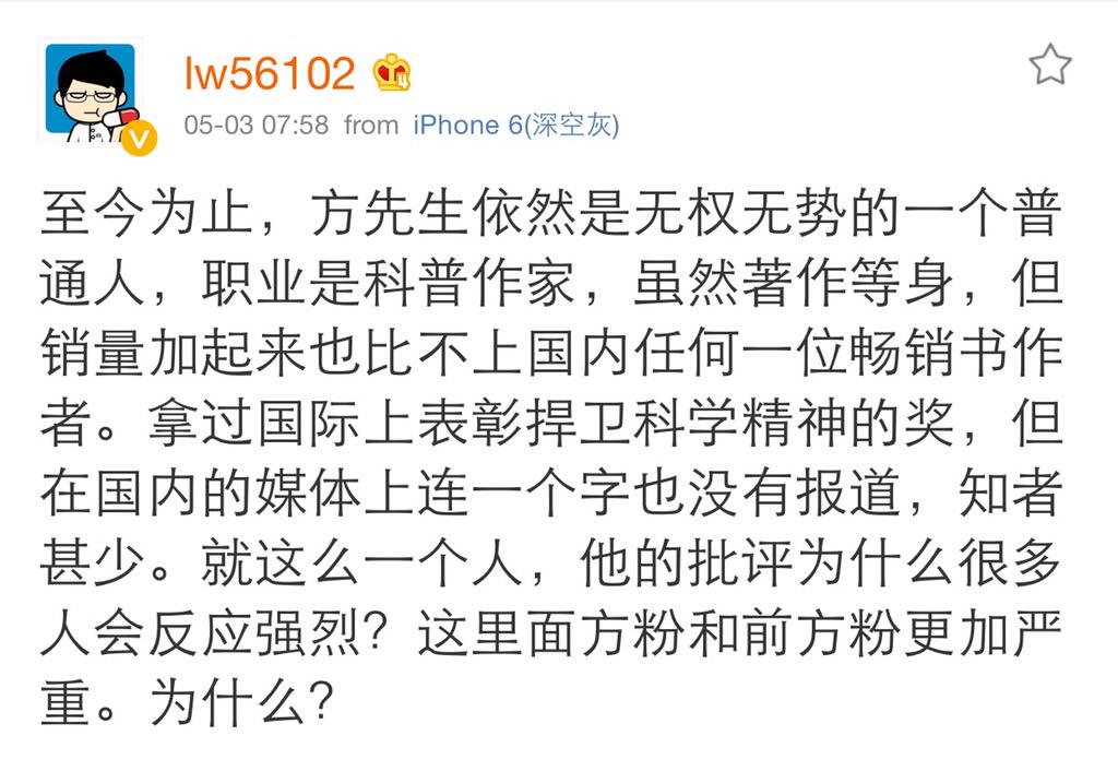 方舟子 @fangshimin · May 3搞错顺序了。是这些“方粉”主动来挑衅被我反震回去,就呼天抢地起来,好像他们“支持”我我就该对他们的挑衅宽宏大量似的。那些不来挑衅的“方粉”我还是很宽容的,即使有看不惯的也懒得批评。忆仔、牧云一叶在暴露前组织的那些活动我看不惯也没说啥嘛 https://pbs.twimg.com/media/CEIgVvgUgAA5SDc.jpg:large