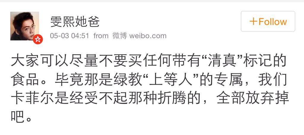 方舟子 @fangshimin · May 5就知道这时候北京张胖子、无穷的探索等理客中该跳出来与方黑们抱团对我做痛心疾首状了。你买的是商品,吃的是食品,管人家做的时候搞什么无害仪式、有没有交管理费。他们是不是也要去抵制有“洁食”“有机食品”“绿色食品”“非转基因”标识的食品? https://pbs.twimg.com/media/CESdQapWgAEyf1R.jpg:large