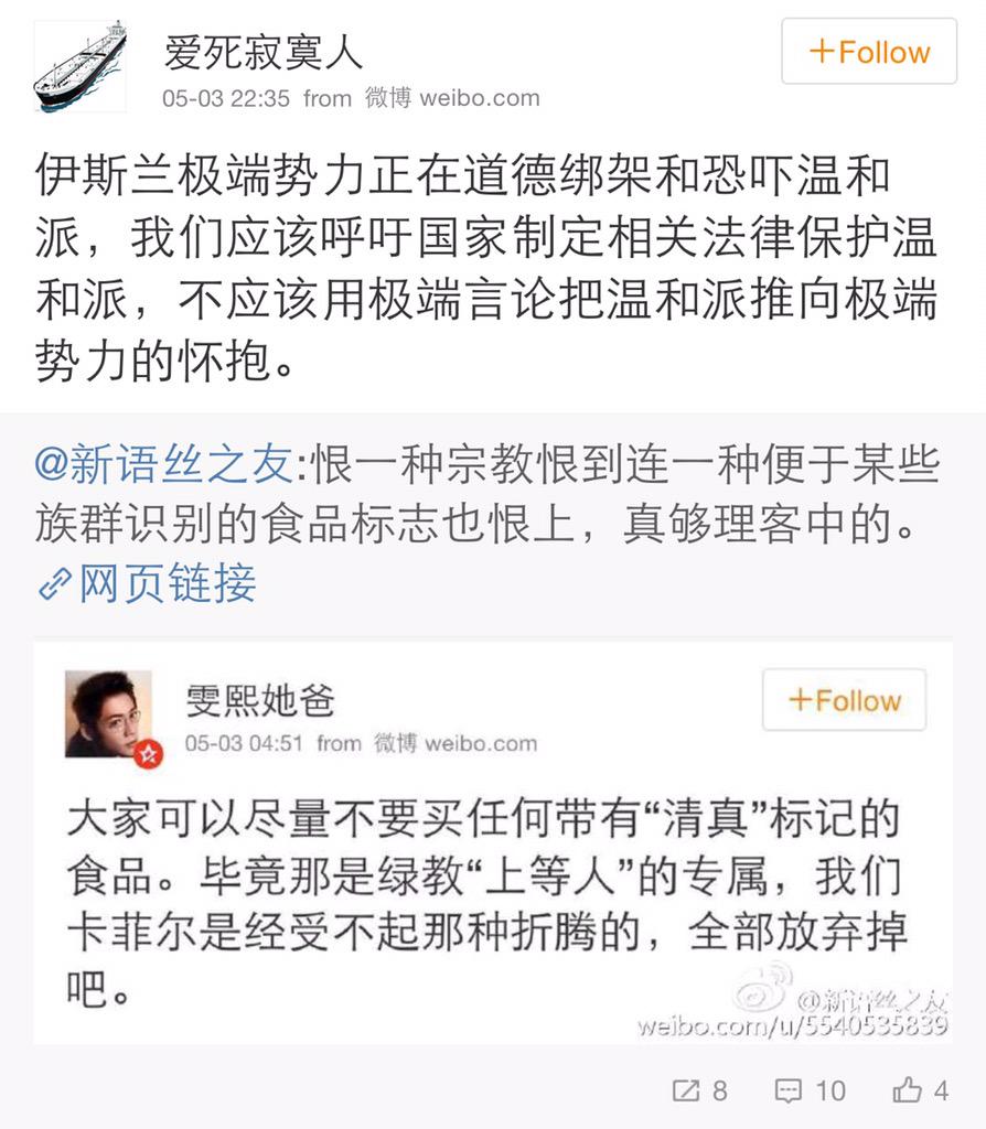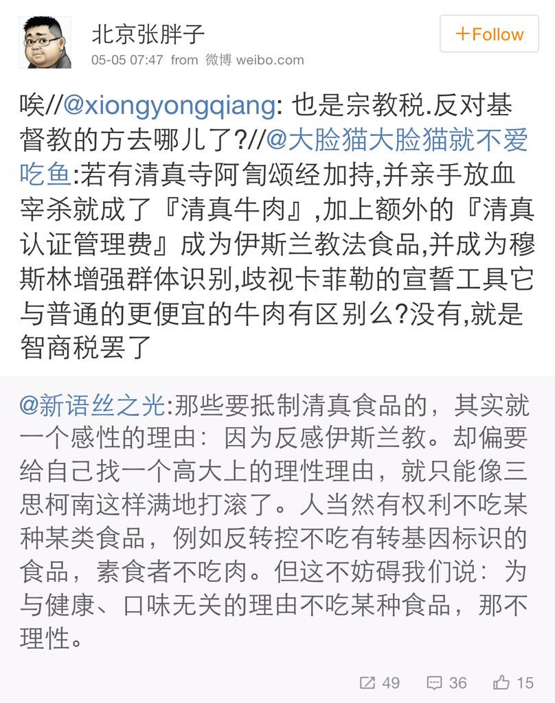 方舟子 @fangshimin · May 4打着清真标志的商店去卖猪肉猪油食品不对,应依法处理。一些回民因此去砸店也不对,也应依法处理。有些人不去呼吁政府依法办事,却呼吁抵制清真食品,属于脑袋进水。