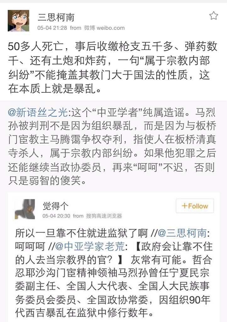 方舟子 @fangshimin · May 4这个“中亚学者”纯属造谣。马烈孙被判刑不是因为组织暴乱,而是因为与板桥门宦教主马腾霭争权夺利,指使人在板桥清真寺杀人,属于宗教内部纠纷。如果他犯罪之后还能继续当政协委员,再来“呵呵”不迟,否则只是弱智的傻笑。 https://pbs.twimg.com/media/CENuEXyUEAAzoLL.jpg:large