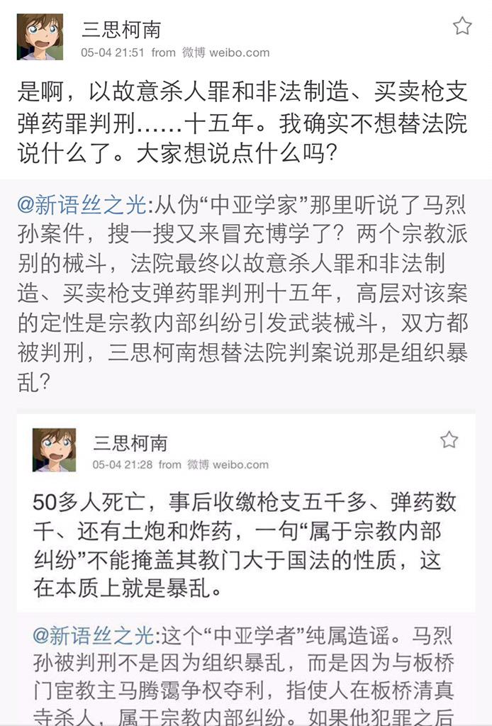 方舟子 @fangshimin · May 4从伪“中亚学家”那里听说了马烈孙案件,搜一搜又来冒充博学了?两个宗教派别的械斗,法院最终以故意杀人罪和非法制造、买卖枪支弹药罪判刑十五年,高层对该案的定性是宗教内部纠纷引发武装械斗,双方都被判刑,三思柯南想替法院判案说那是组织暴乱? https://pbs.twimg.com/media/CEN2XtmVIAA1A7p.jpg:large
