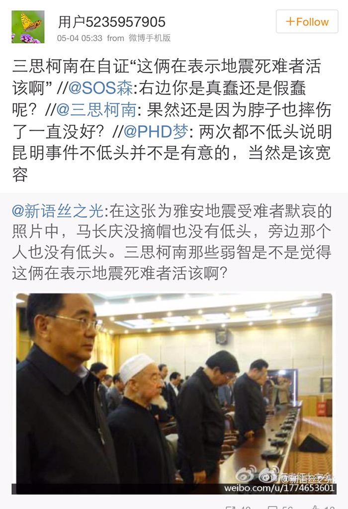 邓志国 ?@BobDeng2 May 4 @fangshimin 伊斯兰教长马长庆,在全体为昆明死难者默哀的时候,拒绝起立、默哀,这种算什么行为?应该宽容还是批评?