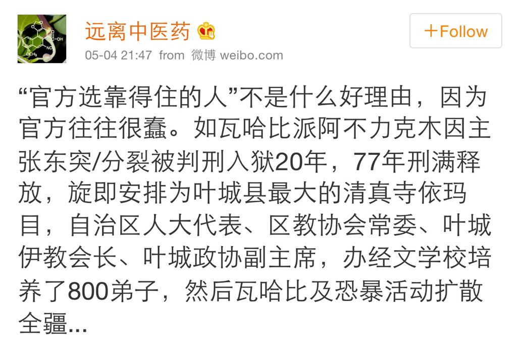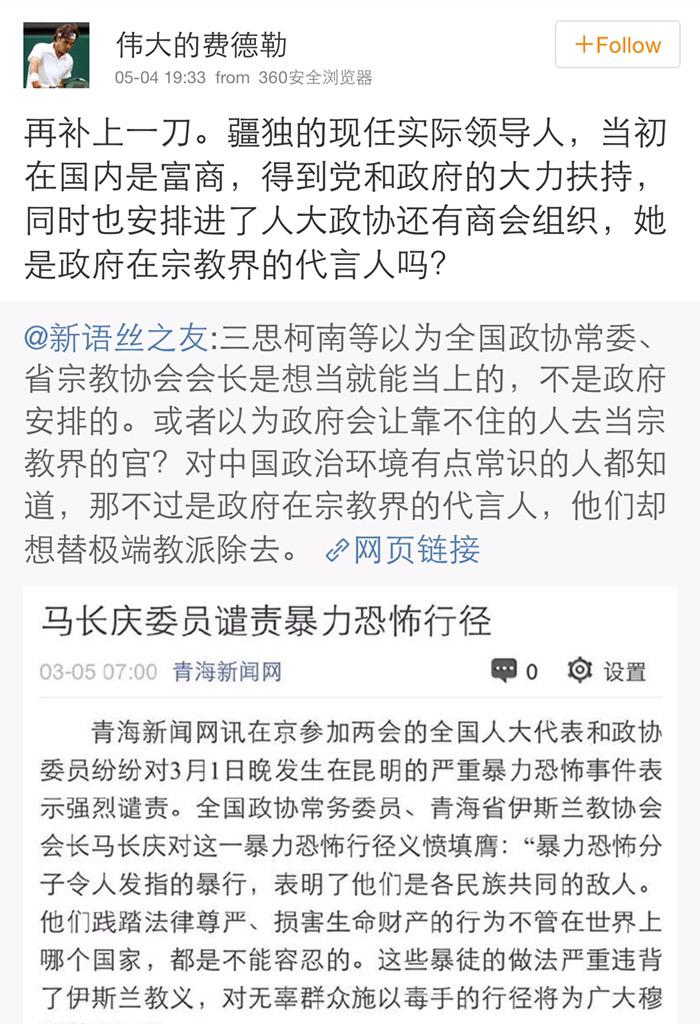 方舟子 @fangshimin · May 4有的人是恨不得把16亿穆斯林、10个中国少数民族都当成或逼成恐怖主义分子。 https://pbs.twimg.com/media/CEJNxDAUUAEu9YU.jpg:large