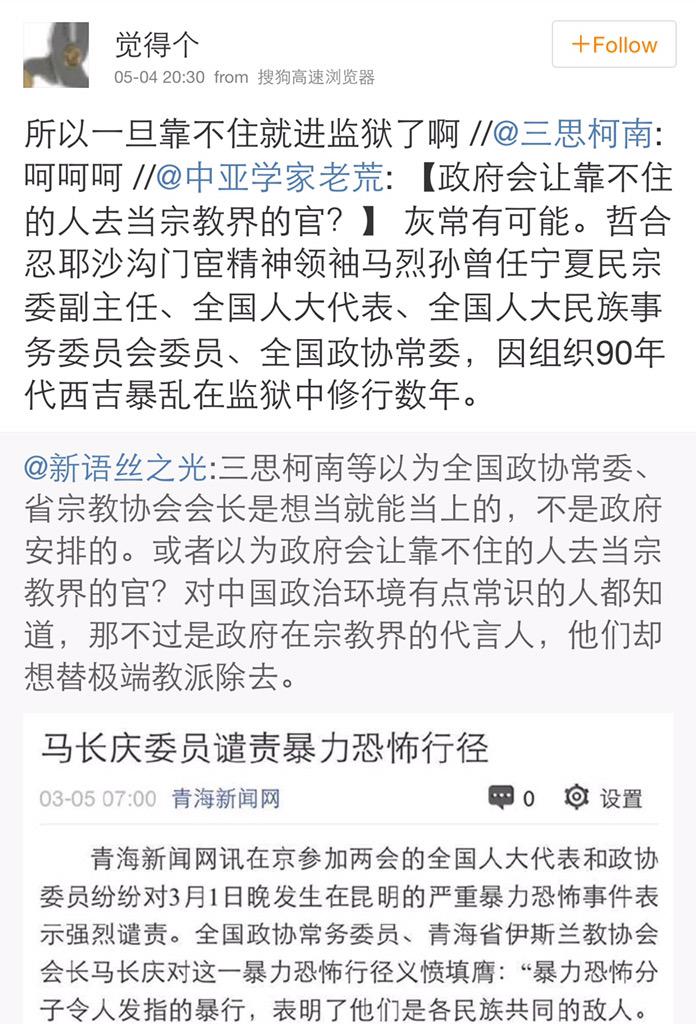 方舟子 @fangshimin · May 4三思柯南等以为全国政协常委、省宗教协会会长是想当就能当上的,不是政府安排的。或者以为政府会让靠不住的人去当宗教界的官?对中国政治环境有点常识的人都知道,那不过是政府在宗教界的代言人,他们却想替极端教派除去。 https://pbs.twimg.com/media/CENQEPPUEAEfsJ1.jpg:large