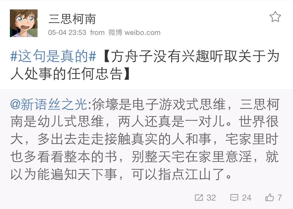 方舟子 @fangshimin · May 4徐壕是电子游戏式思维,三思柯南是幼儿式思维,两人还真是一对儿。世界很大,多出去走走接触真实的人和事,宅家里时也多看看整本的书,别整天宅在家里意淫,就以为能遍知天下事,可以指点江山了。