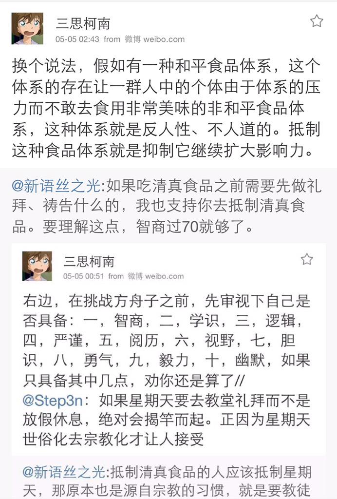 方舟子 @fangshimin · May 5那些要抵制清真食品的,其实就一个感性的理由:因为反感伊斯兰教。却偏要给自己找一个高大上的理性理由,就只能像三思柯南这样满地打滚了。人当然有权利不吃某种某类食品,例如反转控不吃有转基因标识的食品,素食者不吃肉。但这不妨碍我们说:为与健康、口味无关的理由不吃某种食品,那不理性。