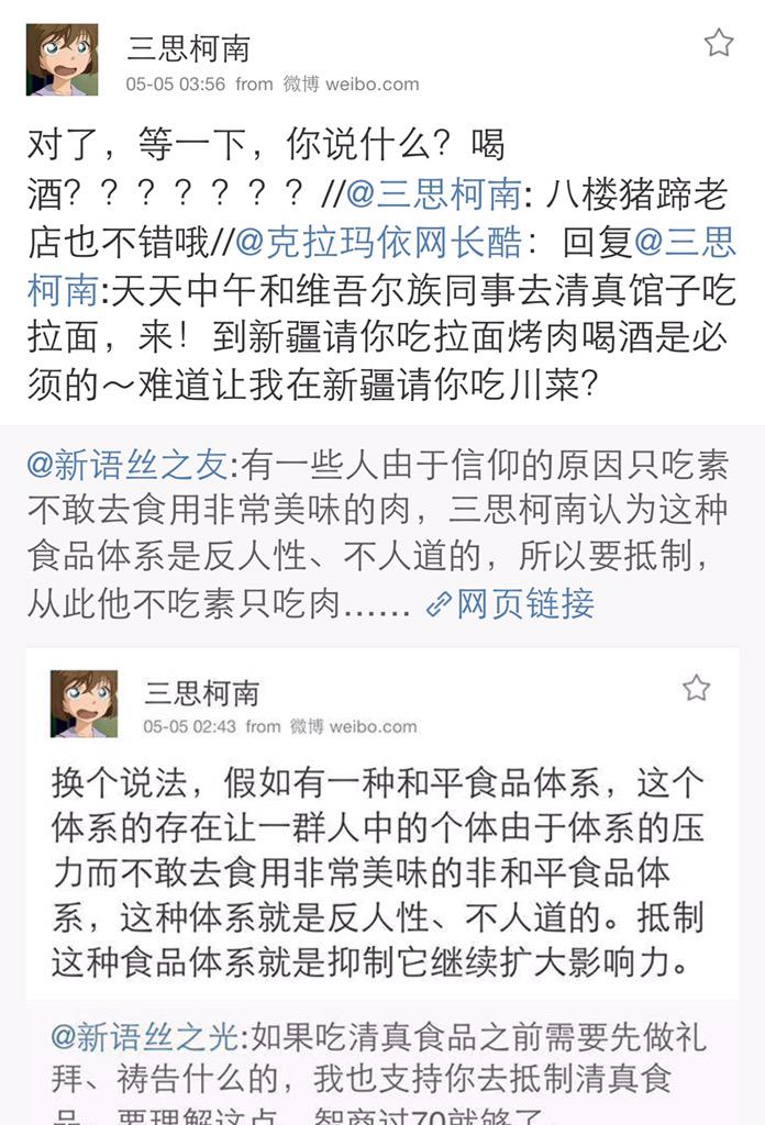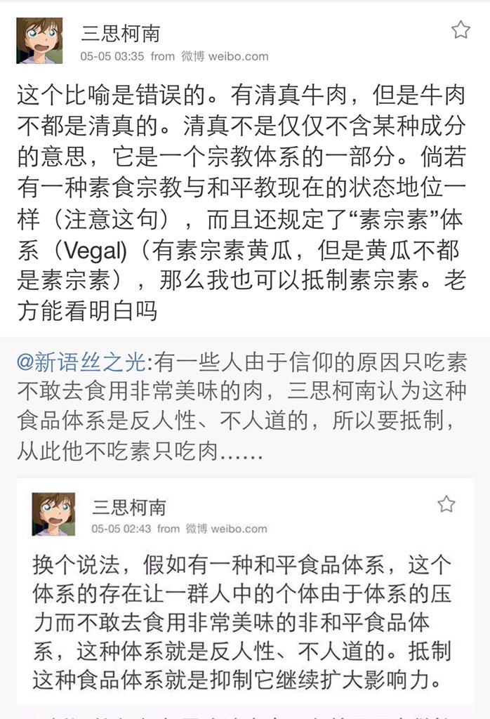 方舟子 @fangshimin · May 5有一些人由于信仰的原因只吃素不敢去食用非常美味的肉,三思柯南认为这种食品体系是反人性、不人道的,所以要抵制,从此他不吃素只吃肉…… https://pbs.twimg.com/media/CEPDEiIUIAEoHrM.jpg:large