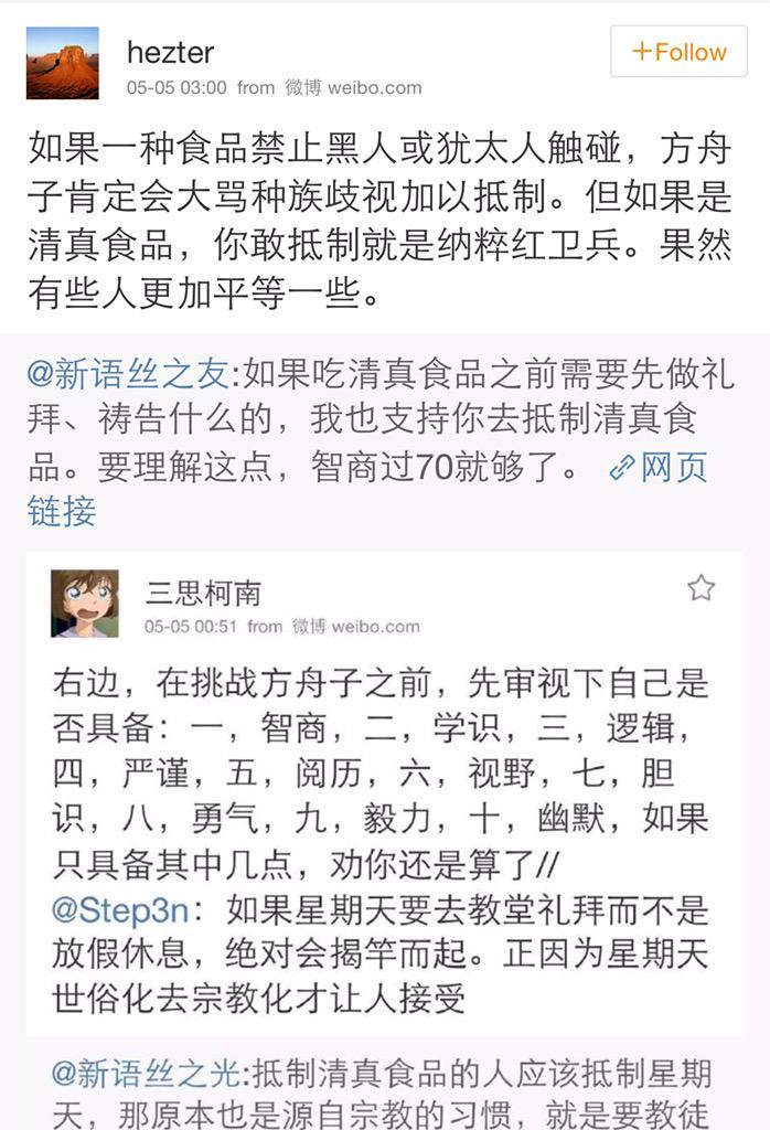 方舟子 @fangshimin · May 5如果一种食品禁止黑人或犹太人触碰,抵制的办法应该是号召黑人或犹太人都来吃。不过清真食品什么时候禁止非穆斯林吃了? https://pbs.twimg.com/media/CEPPRhMUkAAJdXf.jpg:large