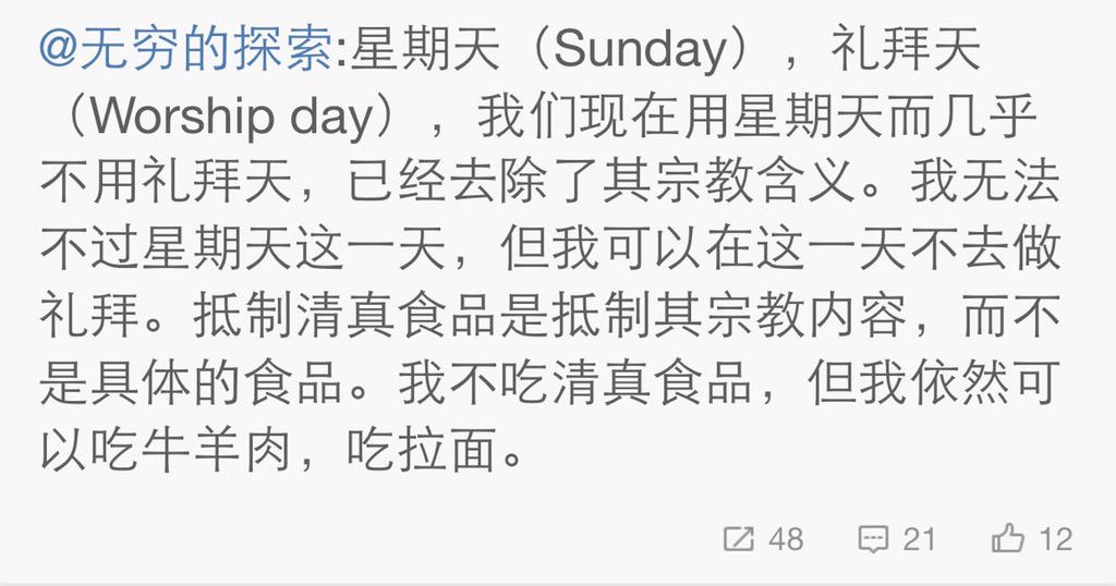 方舟子 @fangshimin · May 5抵制清真食品的人应该抵制星期天,那原本也是源自宗教的习惯,就是要教徒去做礼拜。