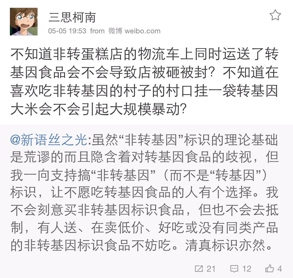 方舟子 @fangshimin · May 5号称组织过上海转基因品尝会的忆仔,以及“不要脸”土豆牛肉高粱连我几年来一直反对标识转基因食品但支持标识非转基因食品都不知道,大惊小怪,可见根本就没有读过我的几篇文章,从混圈子的“支持者”摇身一变变成方黑是必然的。那些跑去跟三思柯南抱团的,也都是我平时看不上的,真是物以类聚。
