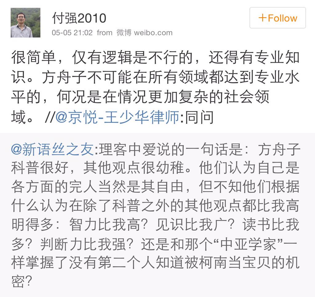 方舟子 @fangshimin · May 5理客中爱说的一句话是:方舟子科普很好,其他观点很幼稚。他们认为自己是各方面的完人当然是其自由,但不知他们根据什么认为在除了科普之外的其他观点都比我高明得多:智力比我高?见识比我广?读书比我多?判断力比我强?还是和那个“中亚学家”一样掌握了没有第二个人知道被柯南当宝贝的机密?