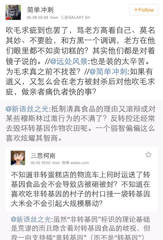 方舟子 @fangshimin · May 6端起机关枪突突,三思柯南要说你诅咒他挨枪子,太不人道了。 https://pbs.twimg.com/media/CEYHsWuUsAE79ci.jpg:large