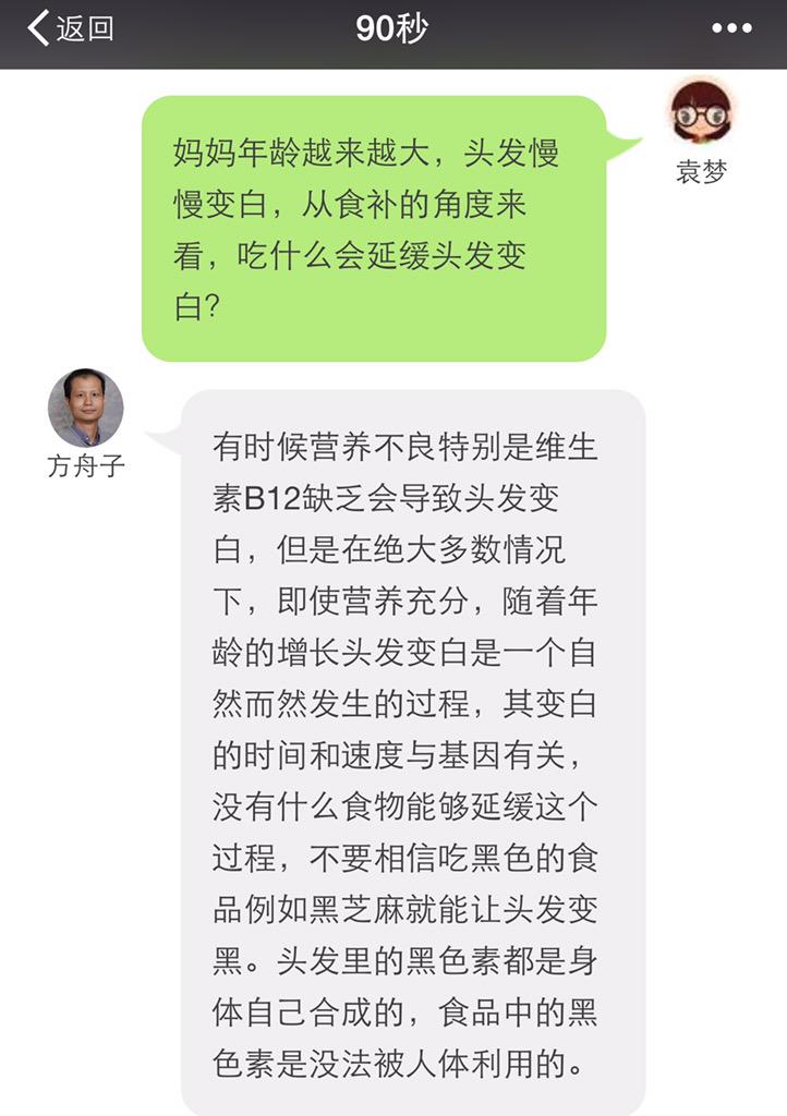 方舟子 @fangshimin · May 1090秒问答【妈妈年龄越来越大,头发慢慢变白,从食补的角度来看,吃什么会延缓头发变白?】 https://pbs.twimg.com/media/CEr2NgHUgAAtzZl.jpg:large