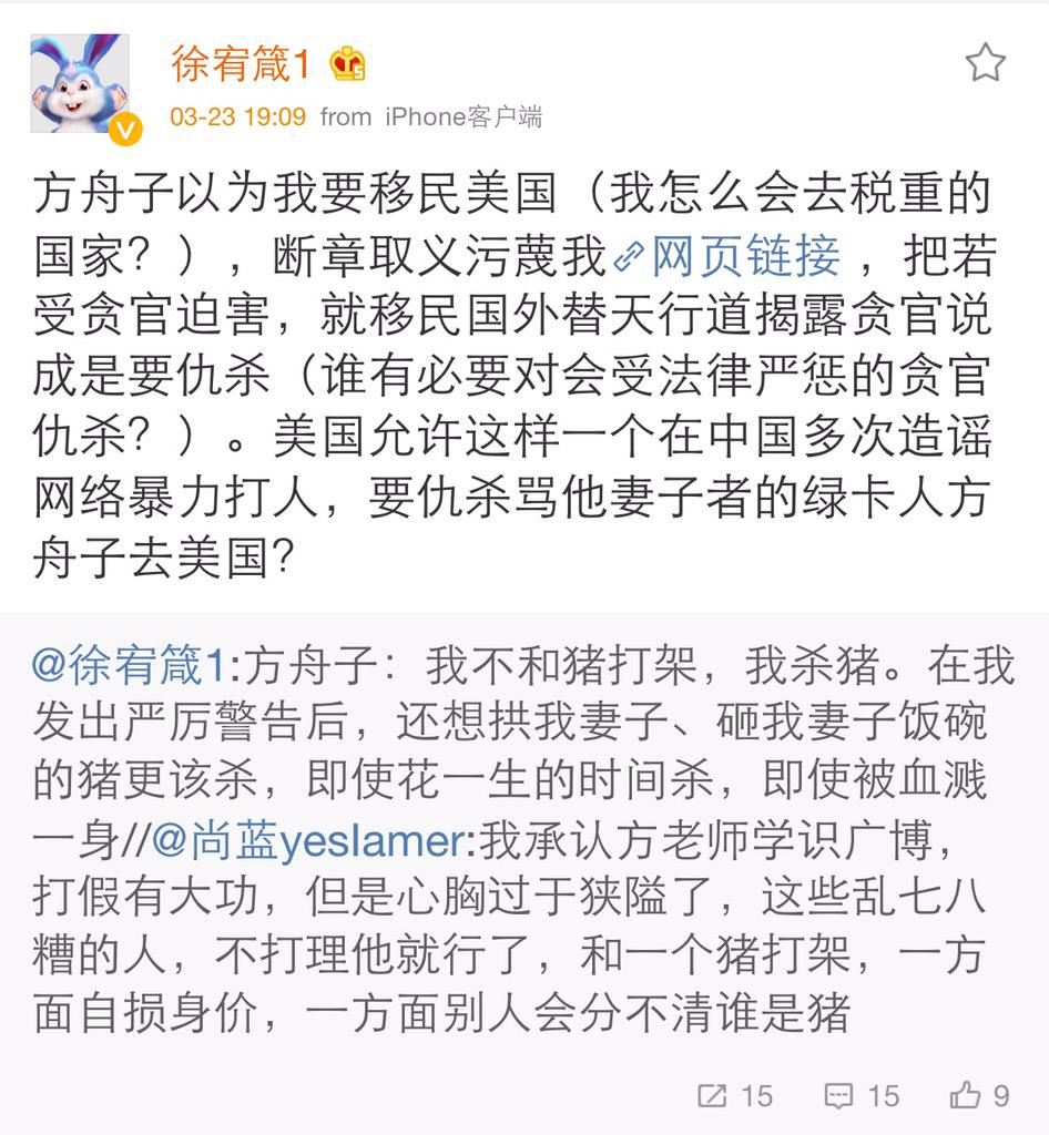 方舟子 @fangshimin · Mar 21他也可能是怕没法到美国合作生育。@luckyangyang: 徐宥箴多次放言移民出国目的是为了报复、“替天行道”。既然徐宥箴什么时候移民就是什么时候开始报复,大规模删微博又是因为害怕美国移民局,那么有理由认为徐宥箴正在酝酿报复行动了。 https://pbs.twimg.com/media/CAnxCS2VAAAvzsN.png:large