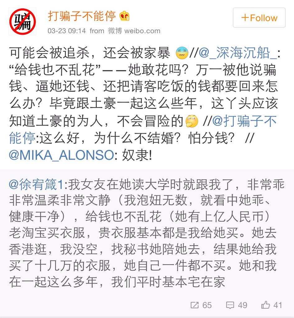 东北御宅 ?@xufang524517 Mar 22 @fangshimin 做他的女朋友是啥好事儿吗?搞不好都不被当成人。不能反抗不能变心,搞不好死于非命都有可能