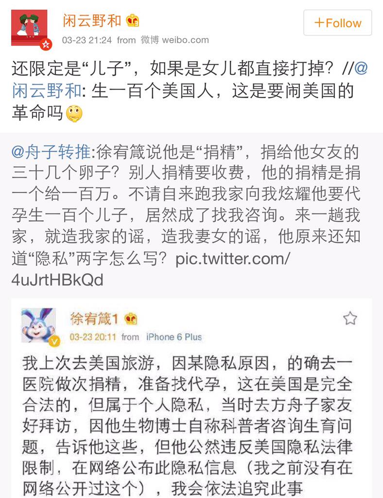 方舟子 @fangshimin · Mar 23徐宥箴说他是“捐精”,捐给他女友的三十几个卵子?别人捐精要收费,他的捐精是捐一个给一百万。不请自来跑我家向我炫耀他要代孕生一百个儿子,居然成了找我咨询。来一趟我家,就造我家的谣,造我妻女的谣,他原来还知道“隐私”两字怎么写? https://pbs.twimg.com/media/CA1SjgIUUAAdFRK.jpg:large