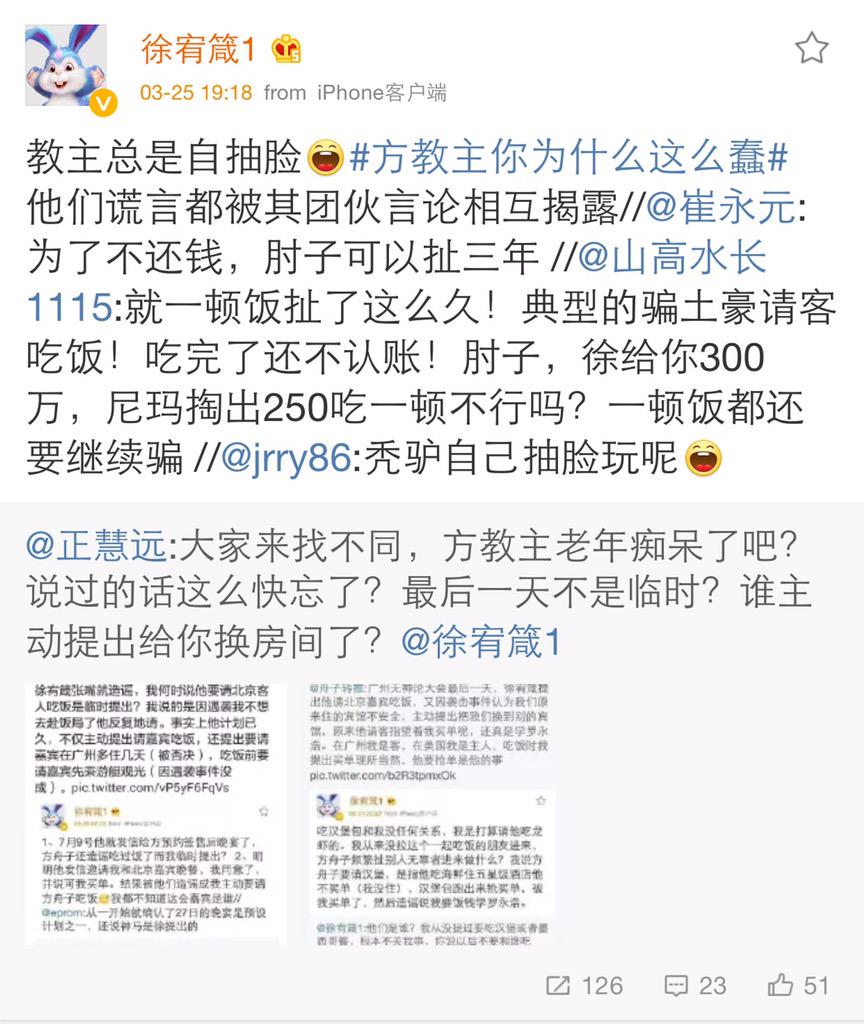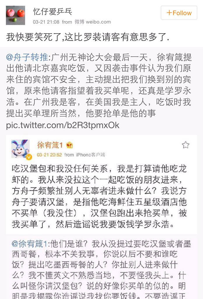 方舟子 @fangshimin · Mar 21有了“徐壕捐款”,再来“徐壕请客”,比“罗装请客”强大多了。徐宥箴智商比罗永浩低很多,大家应该还有笑话看。 https://pbs.twimg.com/media/CArNqDCUYAAY_qX.jpg:large