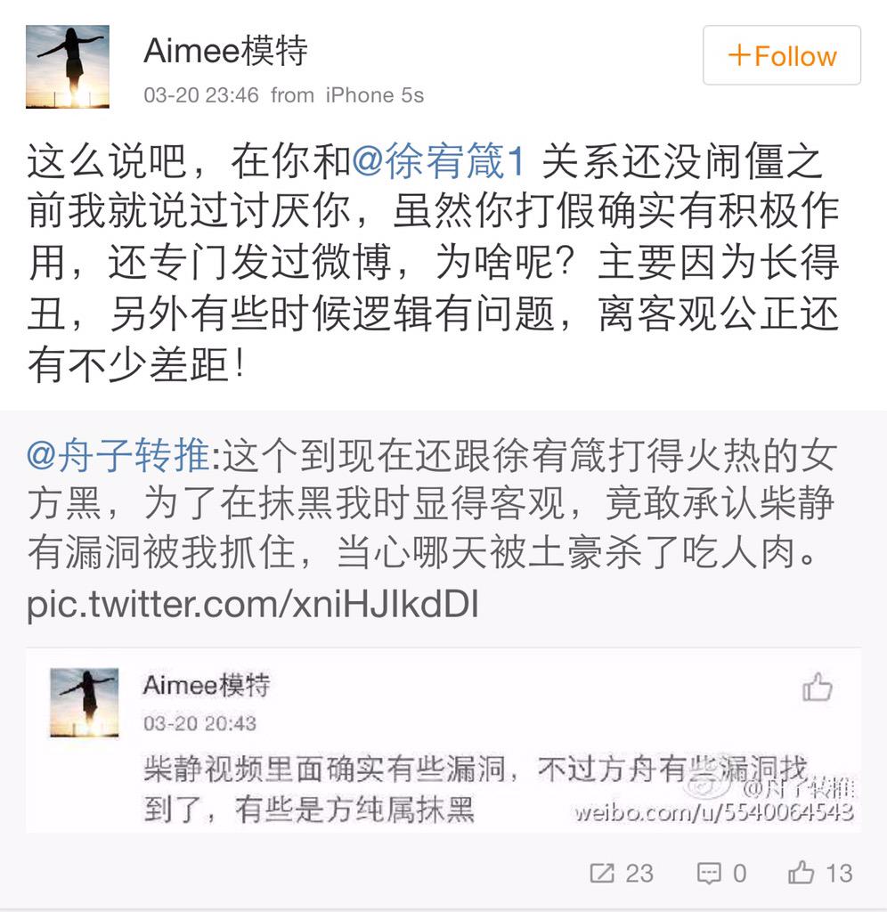 方舟子 @fangshimin · Mar 21我又不是土豪要勾搭她当二奶,更没想跟她“合作生育”,在今天之前根本就没注意到还有这等奇葩女,她那么在乎我的长相干什么?我是丑是美跟她有五毛钱关系?如果一个智商与徐宥箴一样的奇葩女也能发现我的逻辑问题,她一定是用的奇葩逻辑体系。 https://pbs.twimg.com/media/CAm3AWZUQAA5f0c.jpg:large