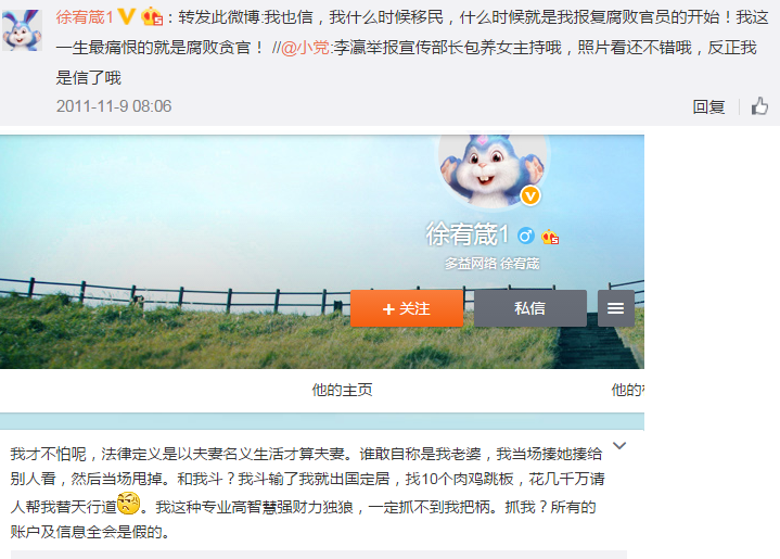 方舟子 @fangshimin · Mar 23搜了一下赵四剧照,还真神似。“@o_ok2007: 徐老板的品位怎么说呢,他放出来的女友照片看着就像“小姐”郭美美,他自己的穿着看着像“乡村爱情”里中过彩票的赵四。但是徐却自信满满,遭到众人耻笑,以为美丑标准都低到他那个层次。所谓“懂管理的企业家”可类比他的“懂家教的爸爸””