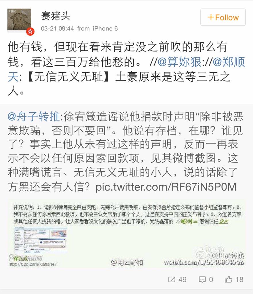 方舟子 @fangshimin · Mar 21徐宥箴造谣说他捐款时声明“除非被恶意欺骗,否则不要回”。他说有存档,在哪?谁见了?事实上他从未有过这样的声明,反而一再表示不会以任何原因索回款项,见其微博截图。这种满嘴谎言、无信无义无耻的小人,说的话除了方黑还会有人信? https://pbs.twimg.com/media/CAobiHVU0AA_Q8v.jpg:large