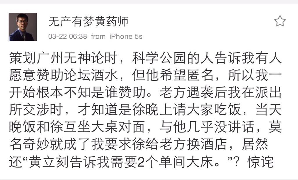 方舟子 @fangshimin · Mar 22这事我也在场。广州无神论会上每个嘉宾做完报告之后,徐宥箴都要第一个抢话筒做高人状滔滔不绝评点一番,不知所云且占用别人提问时间,主持人黄药师忍无可忍,禁止他发言。以此人睚眦必报的性格,估计从此恨上黄药师,正不停造他的谣言呢。 https://pbs.twimg.com/media/CAwKrtvUMAADPjS.jpg:large