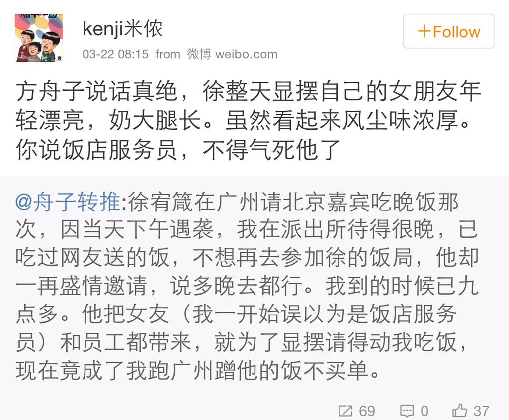 方舟子 @fangshimin · Mar 22徐宥箴在广州请北京嘉宾吃晚饭那次,因当天下午遇袭,我在派出所待得很晚,已吃过网友送的饭,不想再去参加徐的饭局,他却一再盛情邀请,说多晚去都行。我到的时候已九点多。他把女友(我一开始误以为是饭店服务员)和员工都带来,就为了显摆请得动我吃饭,现在竟成了我跑广州蹭他的饭不买单。