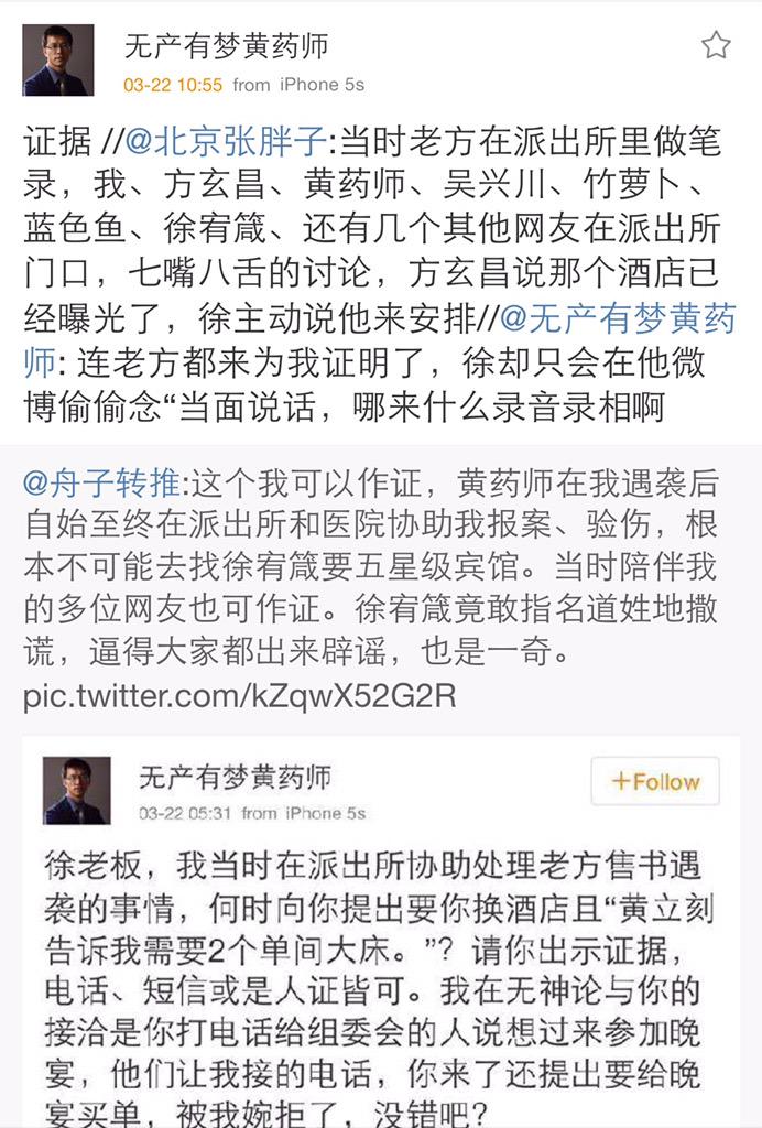 方舟子 @fangshimin · Mar 22这个我可以作证,黄药师在我遇袭后自始至终在派出所和医院协助我报案、验伤,根本不可能去找徐宥箴要五星级宾馆。当时陪伴我的多位网友也可作证。徐宥箴竟敢指名道姓地撒谎,逼得大家都出来辟谣,也是一奇。 https://pbs.twimg.com/media/CAtHHTuUsAEzP_d.jpg:large