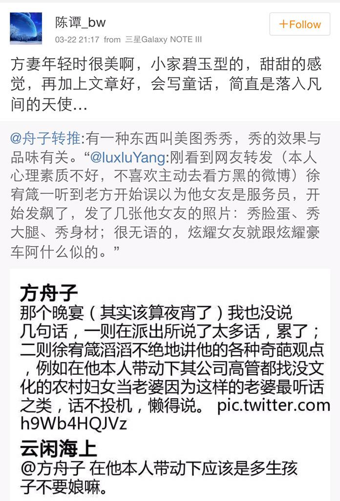 方舟子 @fangshimin · Mar 22有一种东西叫美图秀秀,秀的效果与品味有关。“@luckyangyang: 刚看到网友转发(本人心理素质不好,不喜欢主动去看方黑的微博)徐宥箴一听到老方开始误以为他女友是服务员,开始发飙了,发了几张他女友的照片:秀脸蛋、秀大腿、秀身材;很无语的,炫耀女友就跟炫耀豪车阿什么似的。”