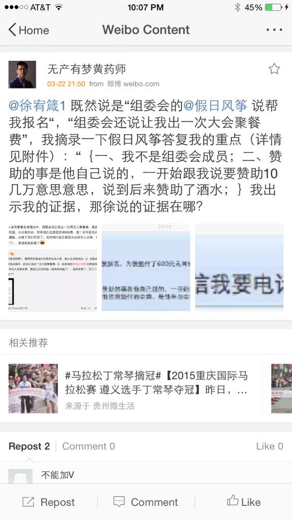 方舟子 @fangshimin · Mar 24这个我也可以作证。当时黄药师宣布:这次晚餐是临时加的,不在大会报名费里,AA制,每人交XX元。徐宥箴站起来说:不用那么麻烦,我包了。被黄药师当场拒绝。现在徐宥箴竟造谣组委会找他来买单。 https://pbs.twimg.com/media/CA2weLjUQAAdmXH.jpg:large