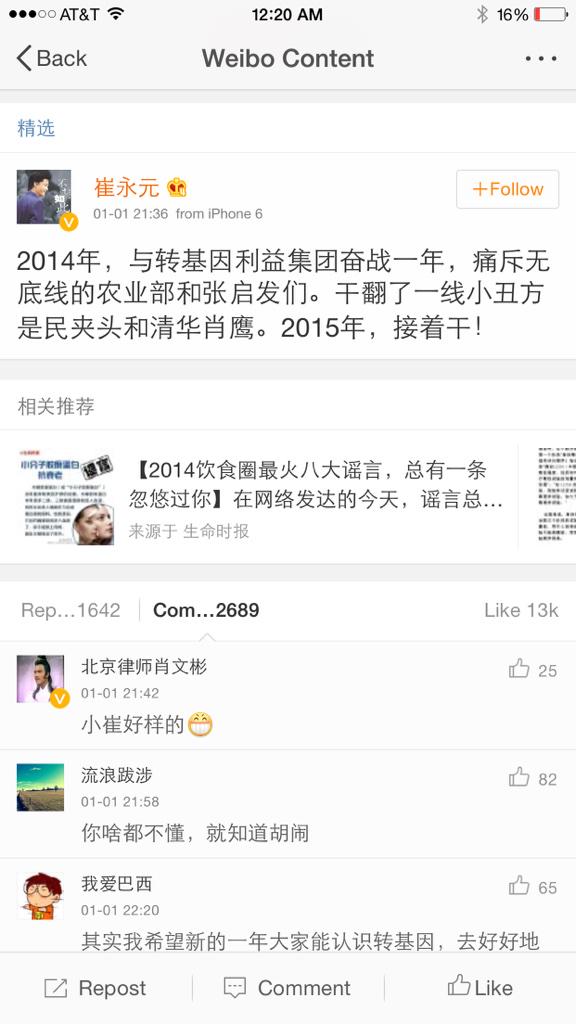 方舟子 @fangshimin · Jan 1“转基因食品有害”是2014年最火的谣言,崔永元该去夹《生命时报》的头了。 https://pbs.twimg.com/media/B6QL2dsCQAEERGj.jpg:large