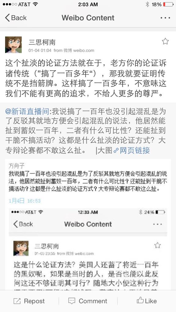 方舟子 @fangshimin · Jan 4我说搞了一百年也没引起混乱是为了反驳其就地方便会引起混乱的说法,他居然能扯到蓄奴一百年,二者有什么可比性?还能扯到干脆不搞活动?这都是什么扯淡的论证方式?大专辩论赛都不敢这么扯。 https://pbs.twimg.com/media/B6fmWTRCEAEIrvQ.jpg:large