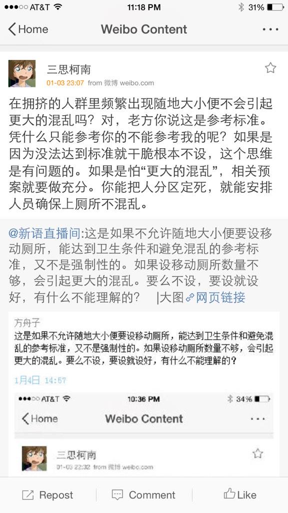 方舟子 @fangshimin · Jan 4柯南说厕所只让急的人用,是不是还得派警察守在厕所门口检查真急假急。@luckyangyang @yunxianhs