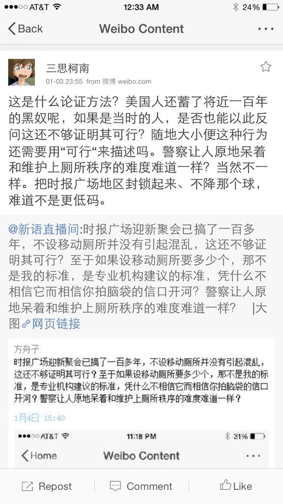 伊雁声 ?@yiyansheng Jan 4其实老方属于最反感随地大小便的人群,但他认为在时报广场迎新聚会的特定状况下,只能如此。老方的看法与这事是否发生在美国没有关系,老方纯碎就事论事,而柯南却从一开始就判定老方唯美国为是,这显然是对老方的曲解。退守“100年蓄奴制”“随地大小便是对的合理的”,更是树稻草人,实无足观也。
