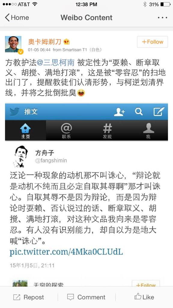 方舟子 @fangshimin · Jan 5推特不是为辩论开发的,但这不是关键,想看的总能看明白。一些人早早就因为政治观念选择了立场,只能一条道走到黑。还有人从一开始就表示在柯南与我的历次辩论中他都是支持柯南的,人各有志,我只是奇怪这种人却要以方粉自居,应该是柯粉才对嘛。@changer558