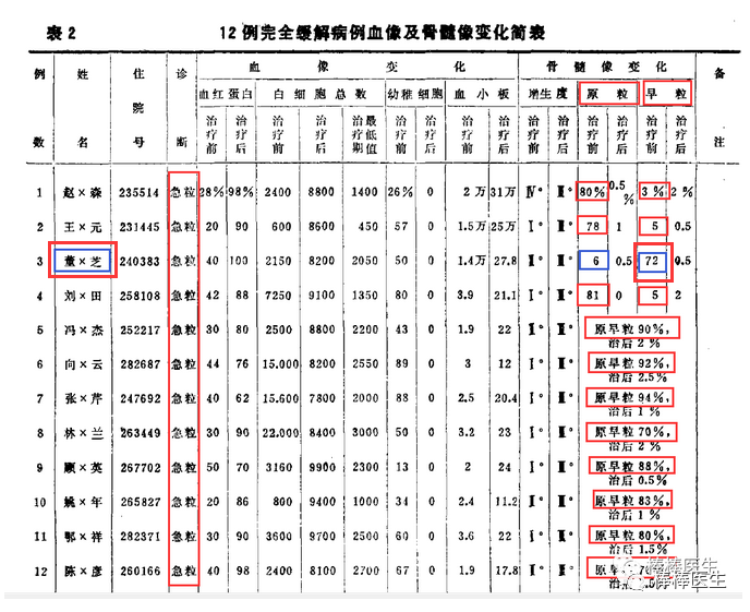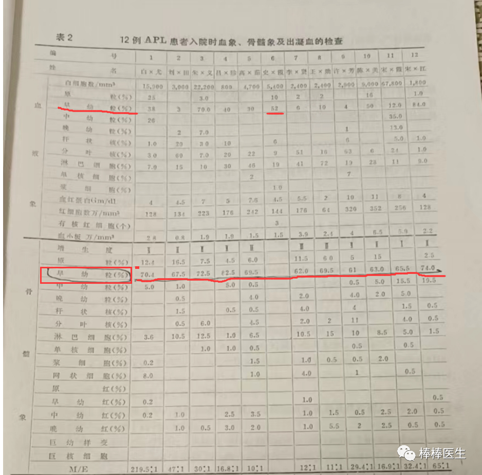 对比一下张亭栋1979年论文中12例完全缓解的病例列表,可以看出,12例骨髓象只有董某芝1例早幼粒细胞比例大于30%(72%),符合APL,但没有诊断出来;其他的11例有3例早幼粒比例小于30%,肯定不是APL;8例把原粒和早幼粒细胞混合计算,无法确定是不是APL。