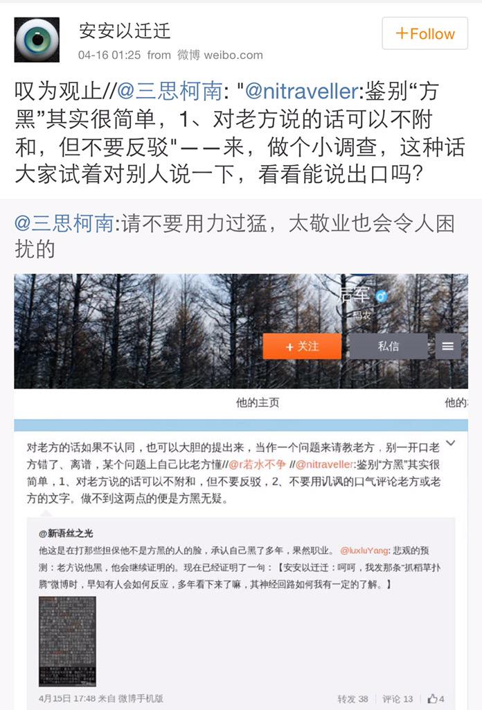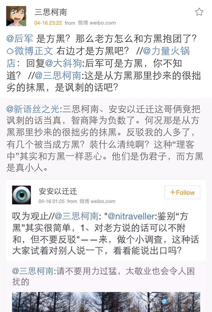方舟子 @fangshimin · Apr 16三思柯南、安安以迁迁这哥俩竟把讽刺的话当真,智商降为负数了。何况那是从方黑那里抄来的很拙劣的抹黑。反驳我的人多了,有几个被当成方黑?装什么清纯啊?这种“理客中”其实和方黑一样恶心。他们是伪君子,而方黑是真小人。 https://pbs.twimg.com/media/CCw8HCUUgAEE1UW.jpg:large