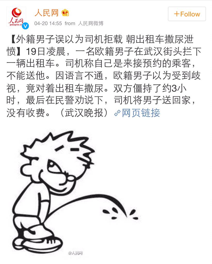方舟子 @fangshimin · Apr 20【外籍男子误以为司机拒载 朝出租车撒尿泄愤】【最后在民警劝说下,司机将男子送回家,没有收费。】民警把撒尿当付费了? https://pbs.twimg.com/media/CDFYXZqUsAENnuh.jpg:large