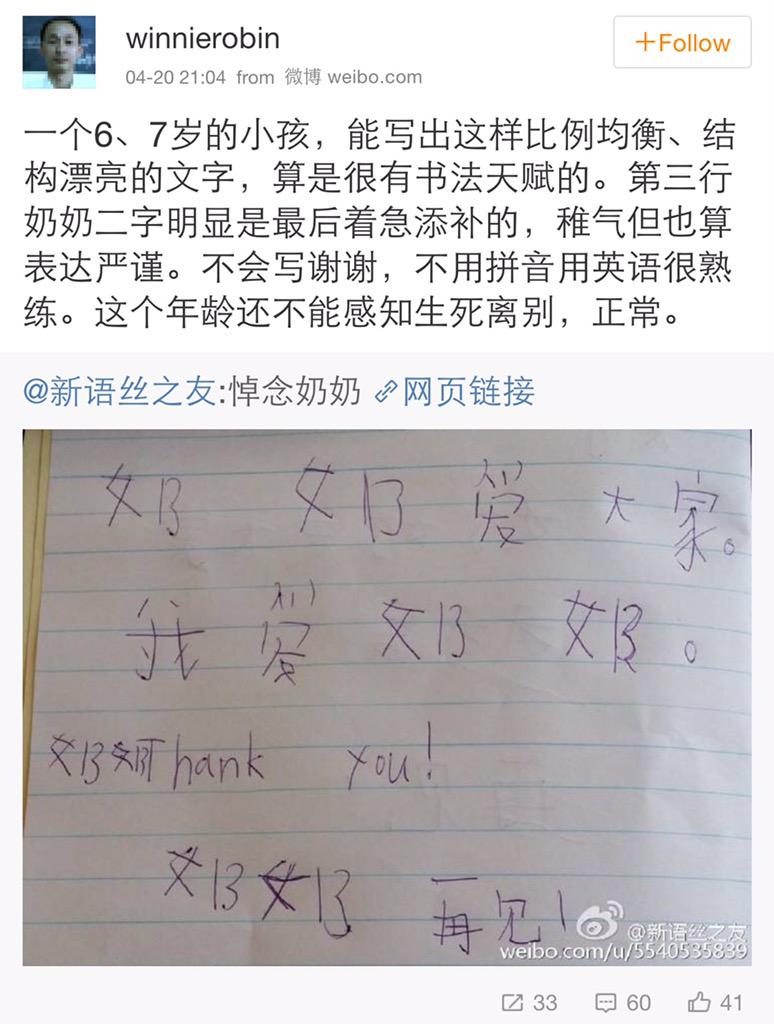 方舟子 @fangshimin · Apr 19悼念奶奶 https://pbs.twimg.com/media/CDAuBbGUMAESpv1.jpg:large