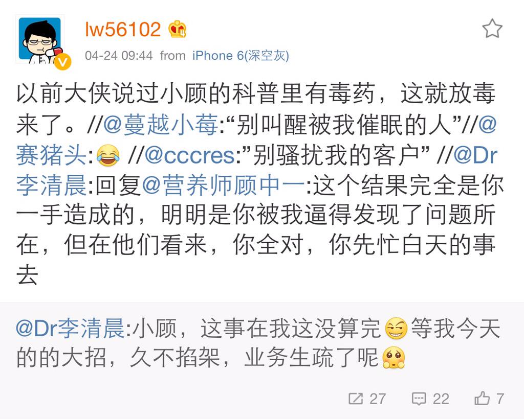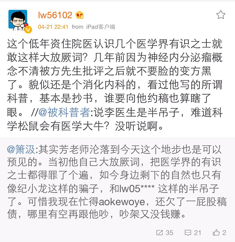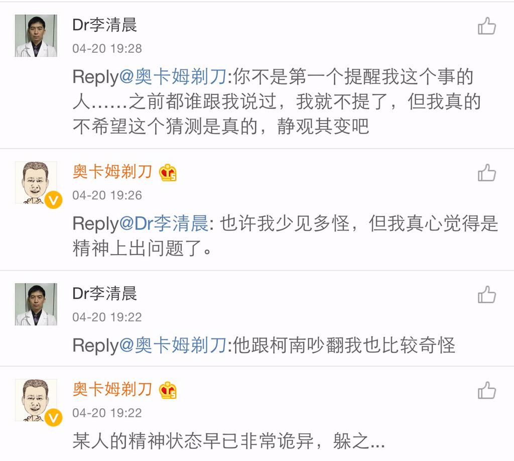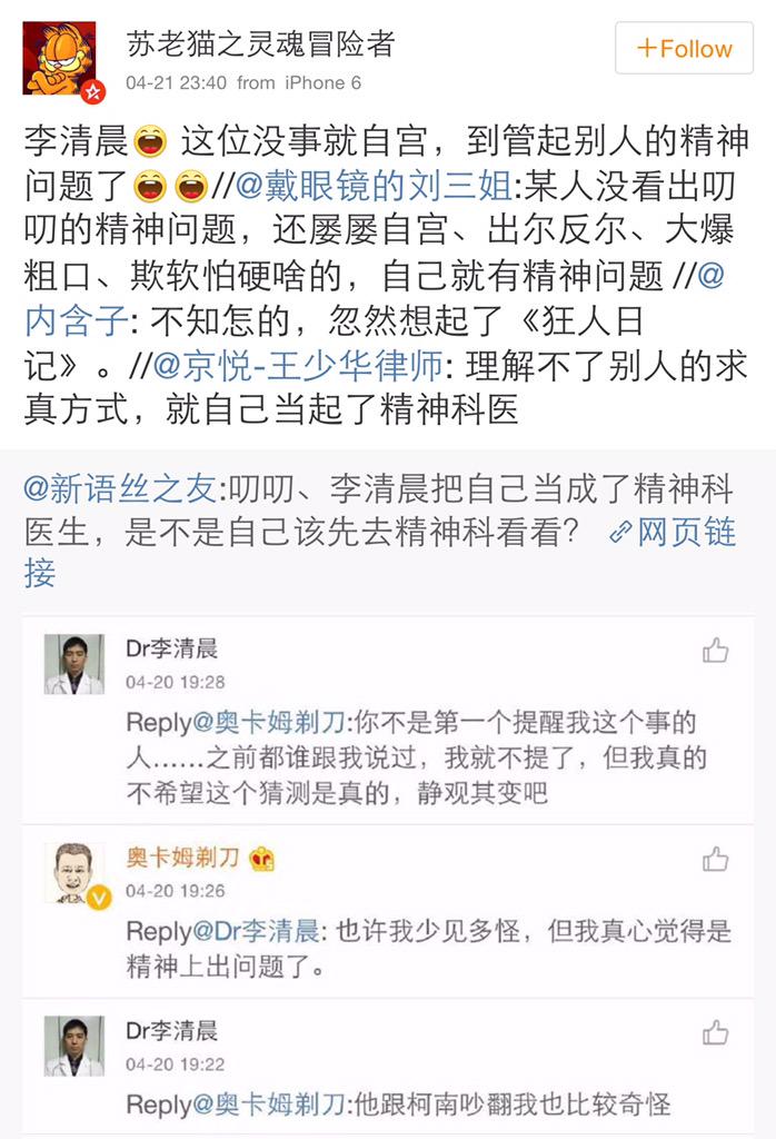 方舟子 @fangshimin · Apr 21叨叨、李清晨把自己当成了精神科医生,是不是自己该先去精神科看看? https://pbs.twimg.com/media/CDHInakVEAA3YsI.jpg:large