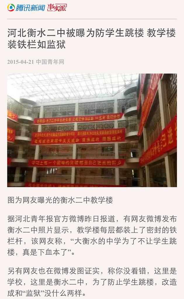 方舟子 @fangshimin · Apr 21【河北衡水二中被曝为防学生跳楼 教学楼装铁栏如监狱】符合消防要求吗?碰到火灾怎么办? https://pbs.twimg.com/media/CDHgqnbVEAId341.jpg:large