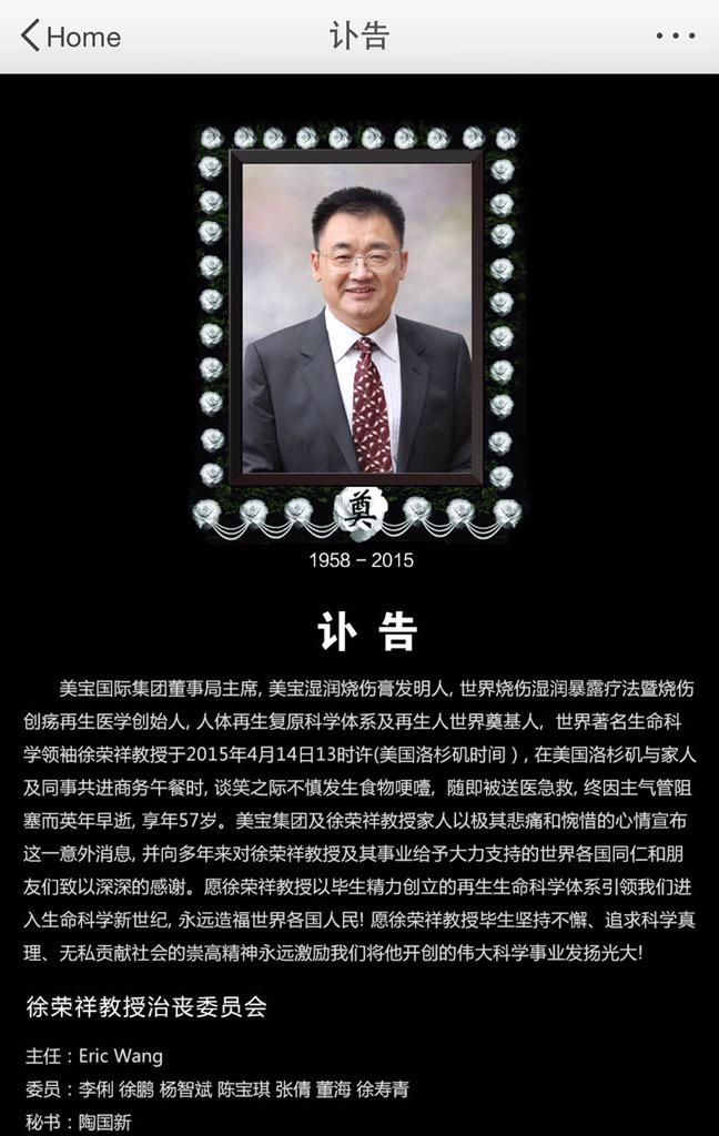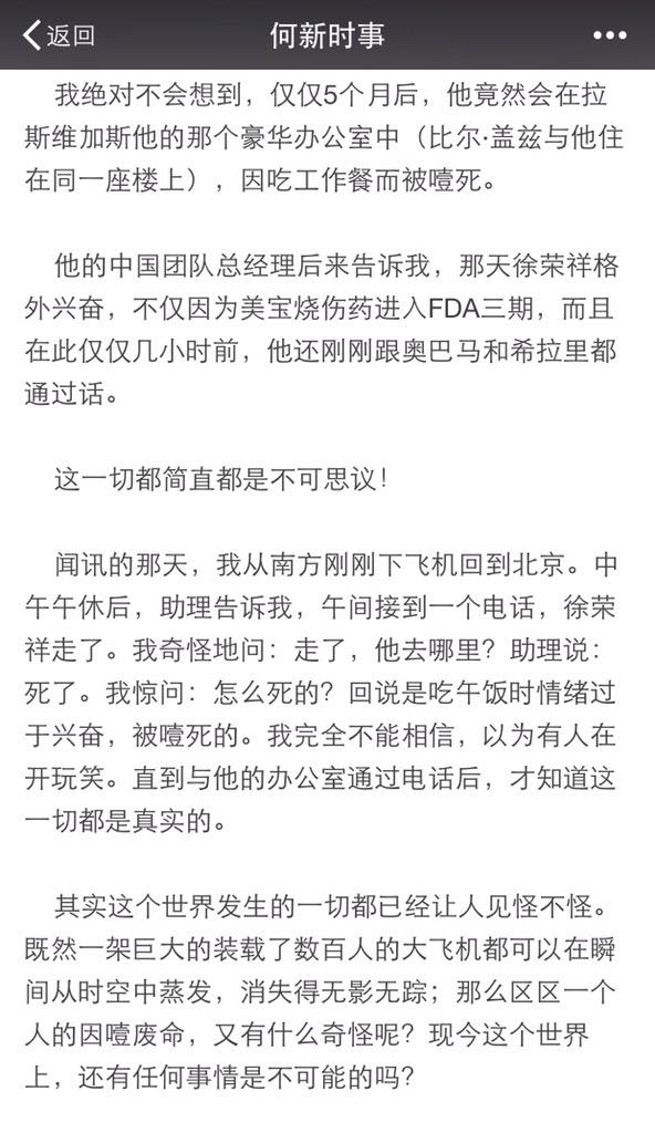 方舟子 @fangshimin · Apr 25在“我们时代最伟大的科学家”徐荣祥噎死之前的几个小时,号称奥巴马和希拉里都打电话给他,要他好好吃饭别噎着吗? https://pbs.twimg.com/media/CDfxgZUVAAALfsn.jpg:large