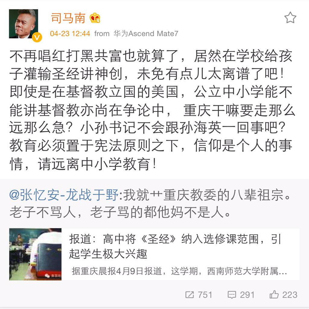 方舟子 @fangshimin · Apr 22美国并不以基督教立国,美国宪法规定政府不得确立任何宗教,美国的公立学校是不许讲基督教《圣经》的,对此没有争论。重庆的中学居然以选修课的名义传基督教,重庆教委应该下课。 https://pbs.twimg.com/media/CDQboEpUUAEt3Is.jpg:large