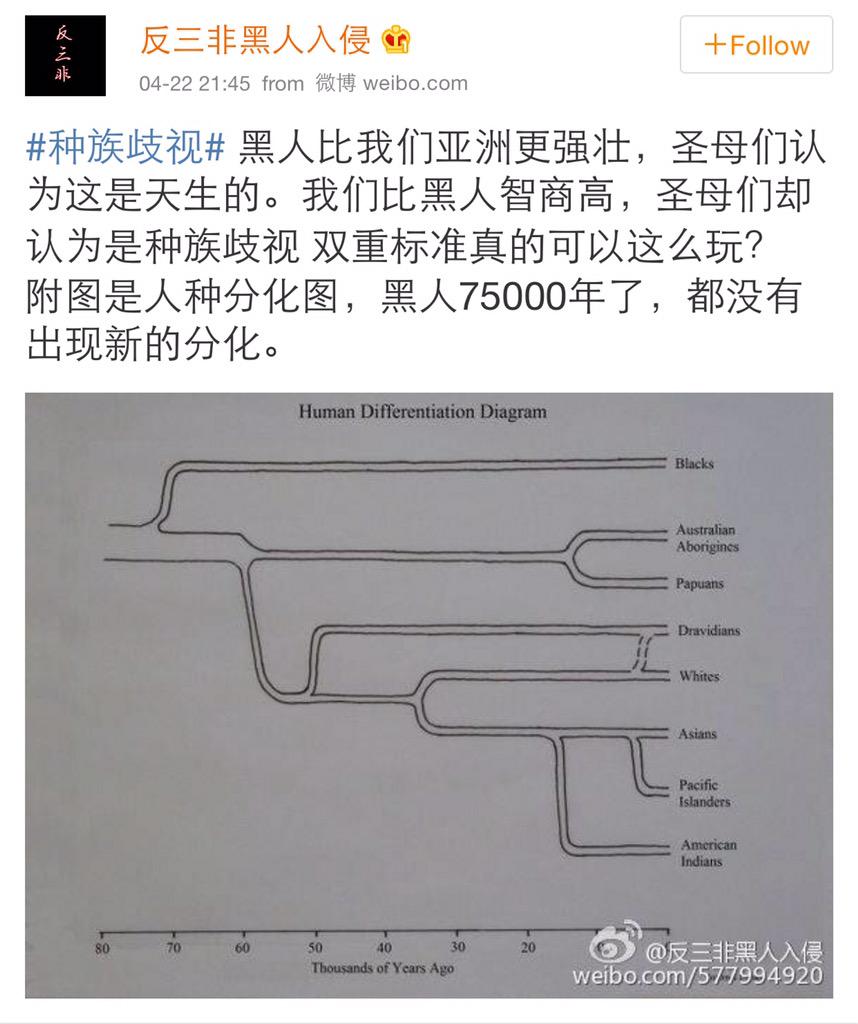 方舟子 @fangshimin · Apr 23这张图纯属误导。实际上所谓“黑人”在遗传上是分化最厉害的,具有最大的多样性,并非单一的遗传群体。倒是世界上其他人都可视为黑人中的一个分支。 https://pbs.twimg.com/media/CDQnPM4UUAAMkiX.jpg:large