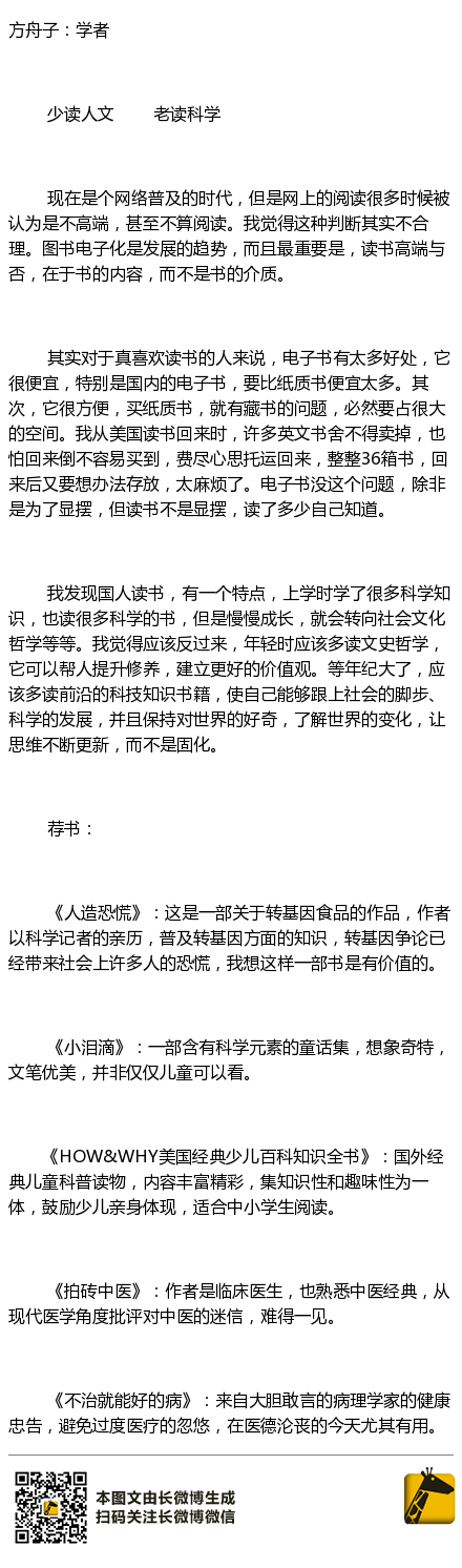 方舟子 @fangshimin · Apr 23读书日北京晨报专访方舟子:少读人文,老读科学 https://pbs.twimg.com/media/CDUsIfIVEAAvX05.png:large