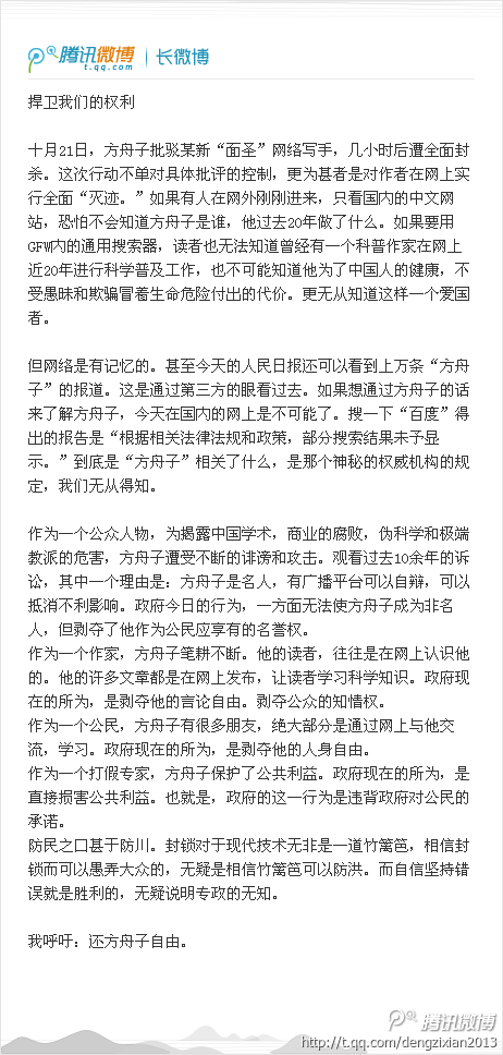 方舟子 retweeted 行走于苍茫大地 @ideartruth · Nov 1一篇英文文章:“Fang Zhouzi Erased from China’s Social Media” http://fangzhouzi-xys.blogspot.co.uk/2014/10/fang-zhouzi-erased-from-chinas-social.html …
