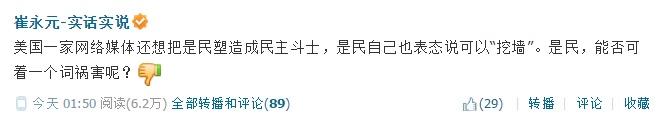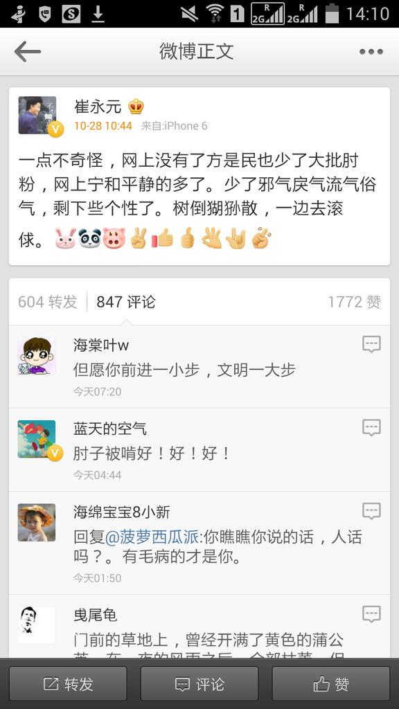 方舟子 @fangshimin · Nov 2天天在网上骂人、夹头的崔永元标榜起宁和平静了,他以为我在国内网络被封口,他就成文明人了? https://pbs.twimg.com/media/B1ZZgsACMAAfIWt.jpg:large