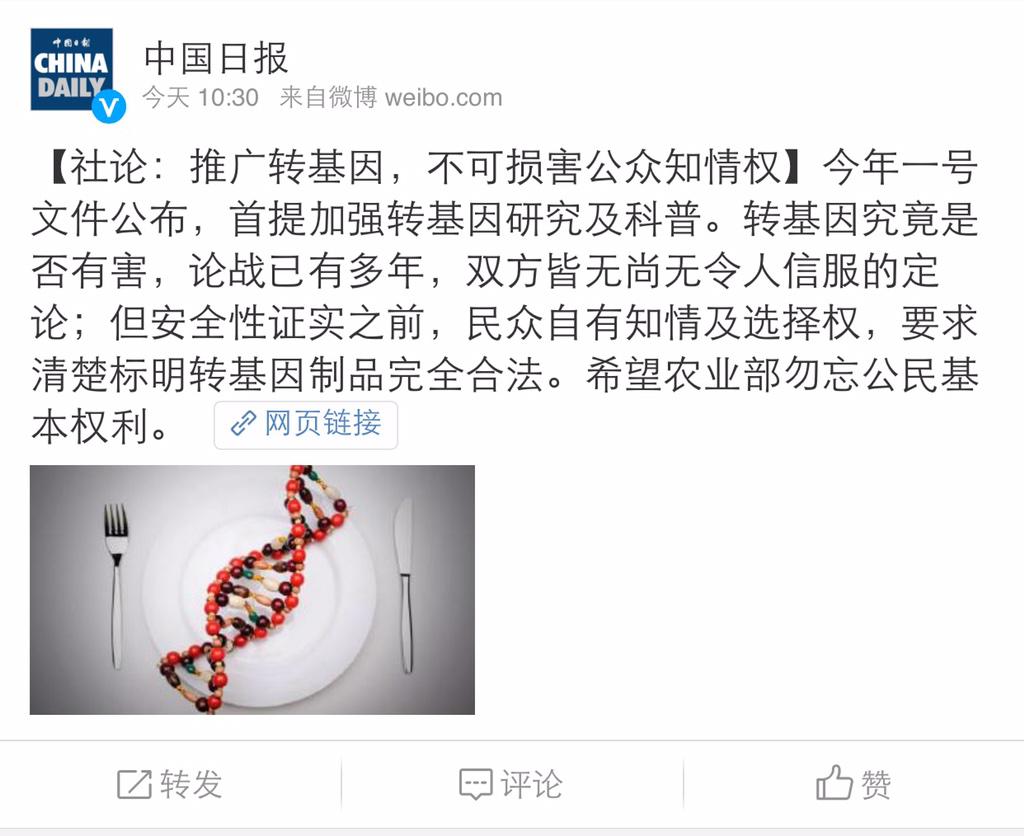 方舟子 @fangshimin · Feb 3看了《中国日报》社论的英文原文,与这条中文微博内容截然不同,是在批评中国政府此前在转基因问题上保持沉默,既没提知情权,也没警告农业部http://m.chinadaily.com.cn/en/2015-02/03/content_19473101.htm?url_type=39&object_type=webpage&pos=1 … 。是微博编辑塞的私货,还是中国日报通过微博发新的社论? https://pbs.twimg.com/media/B87mWojCQAAw__x.jpg:large