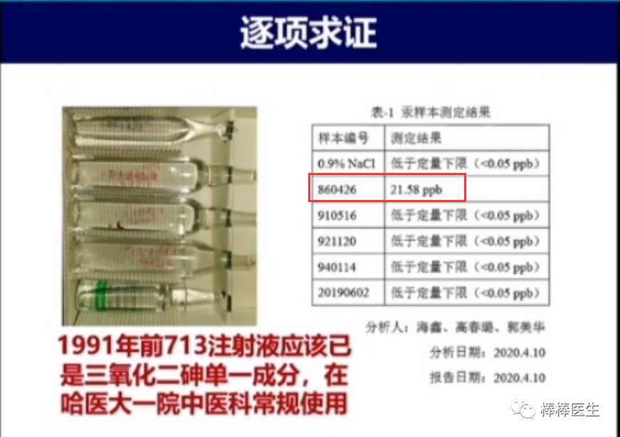 首先,我觉得张院士做了一件非常有意义的事,一定会写进ATO治疗APL的历史的。去年我就知道,在胡晓晨的手里有一些原始批号的713注射液,在系列文章里就建议对这些实物进行检测。张院士得到这批实物后真的做了检测,现在公开了检测结果。结果如下: